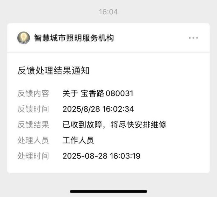 相较于以往依赖电话或现场反馈的传统方式,新铭牌实现了“市民扫码-后台通知-维修响应-结果反馈”的全流程数字化管理。此举既方便市民参与城市照明设施管理,也为路灯维修人员提供了精准信息支持,有效推动路灯维护从“被动响应”向“主动服务”转变,提升城市照明设施精细化管护质效。